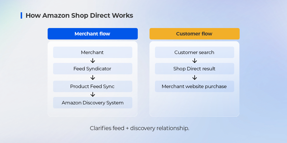 Amazon Shop Direct relies on feed syndicators to deliver merchant product feeds, enabling Amazon to surface those products in search and browsing experiences.