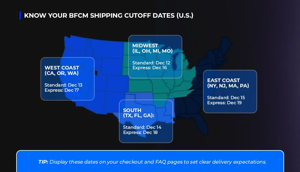 • Set regional timelines: For example, Dec 14 for standard shipping and Dec 18 for express orders.