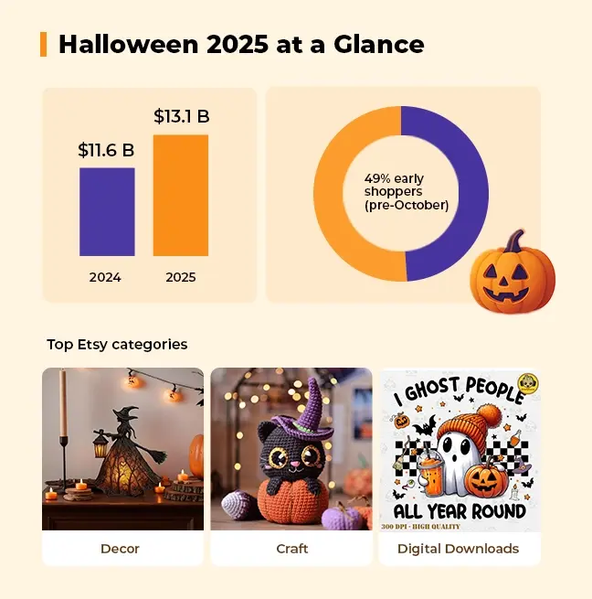 Halloween buying starts months earlier. According to the NRF, 2025, nearly 49% of U.S. shoppers begin their Halloween shopping before October. For Etsy Halloween sellers, that means September is peak visibility season. Sellers who list early capture not only first-mover traffic but also keyword dominance for high-intent searches like Halloween decorations, Halloween crafts, and Halloween digital downloads.