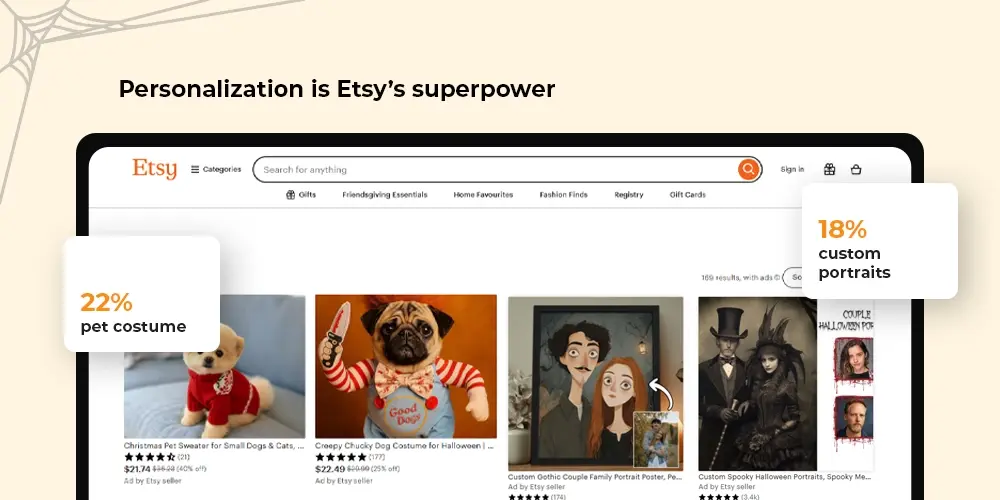 Unlike mass retailers, Etsy thrives on individuality. Search data from eRank (2024) shows terms like “personalized Halloween decor” and “custom pet costume” ranking among top-searched seasonal keywords. Etsy’s algorithm rewards freshness and specificity — the two qualities small creators naturally deliver.