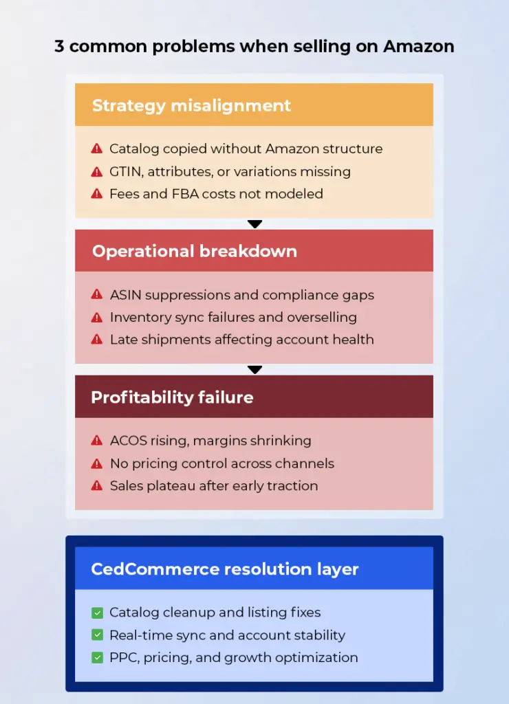 Everything covered so far, such as catalog structure, listing quality, fulfillment, and advertising, has a point of failure. This section explains where CedCommerce fits into each of those failure points.