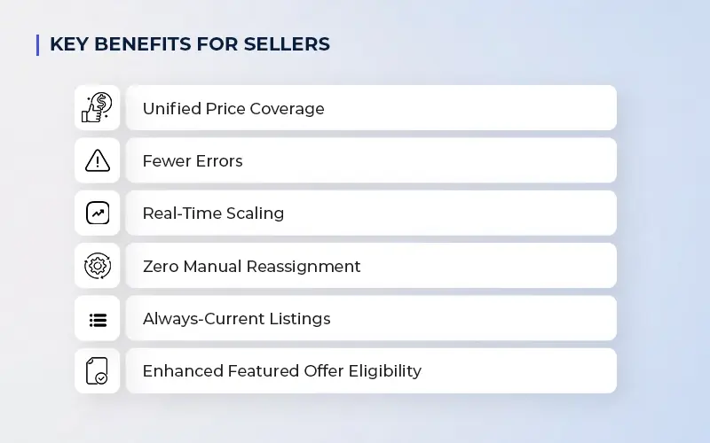 Consistent, competitive prices increase your chances of being selected for the Featured Offer — potentially boosting conversions. | Accurate mapping keeps your products eligible for automated price updates—helping them stay competitively priced and Featured Offer-ready. |